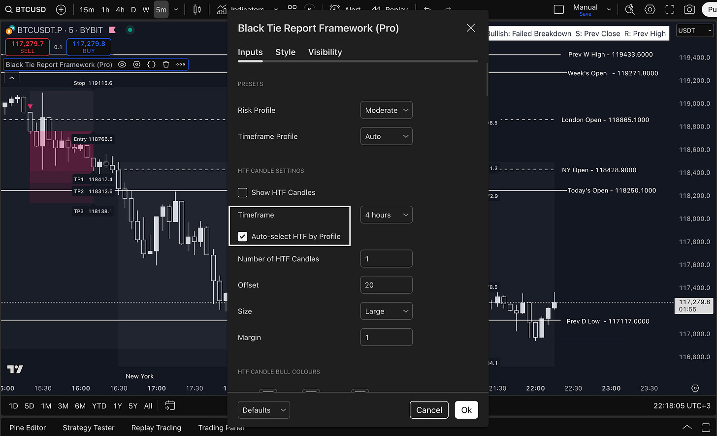 If you prefer a different style, you can always override Bias TF or HTF Candle TF manually by using the Custom Preset.